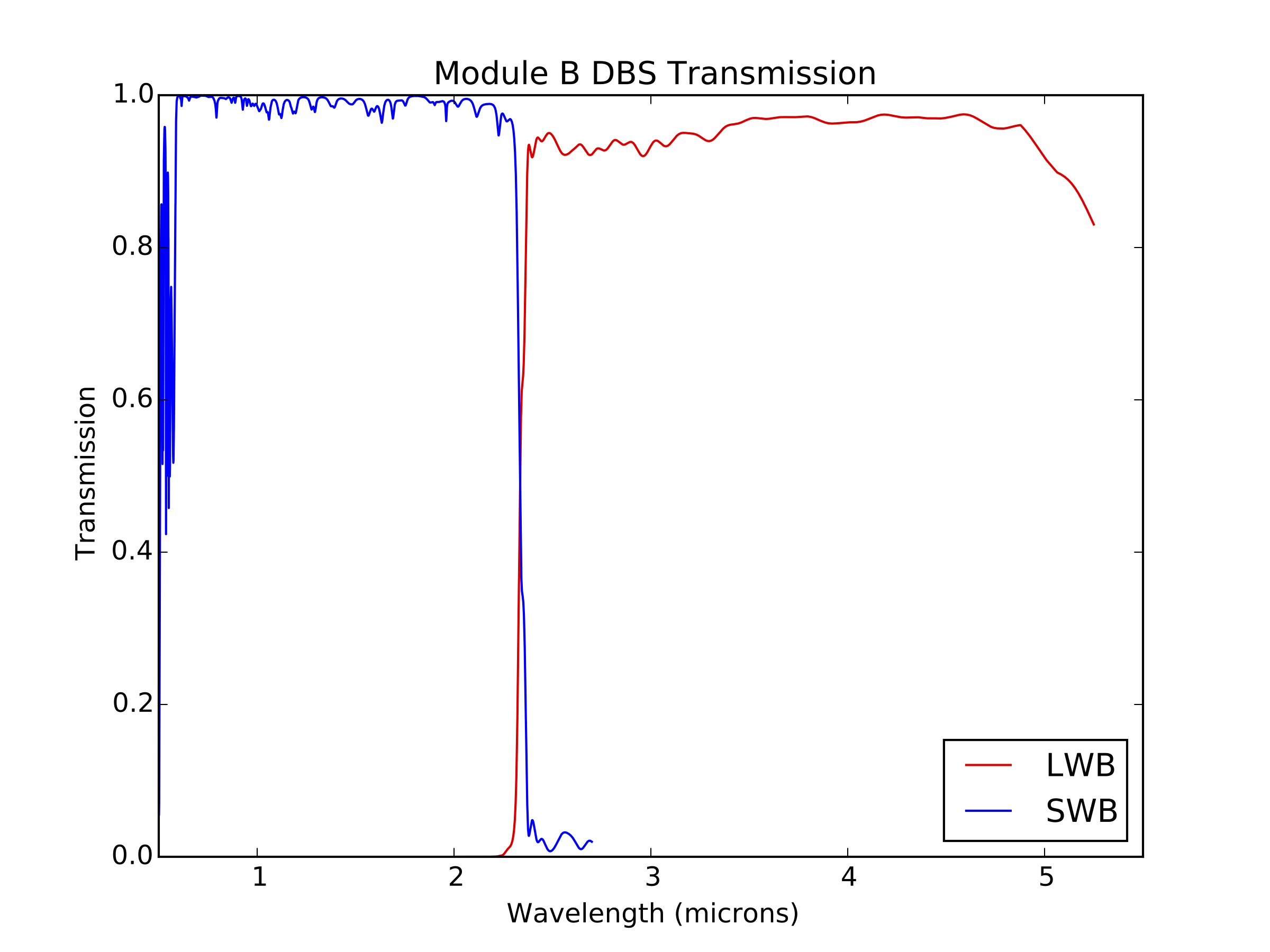 Dichroic transmission in the short and long wavelength channels in module B (SWB and LWB, respectively). These transmissions are included in the NIRCam filter transmissions.